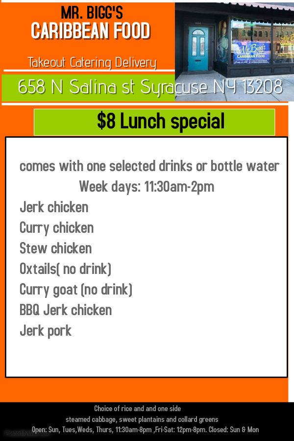 Welcome to Mr. Bigg's Restaurant LLC, a hidden gem located in Syracuse, NY, offering a delightful journey into Caribbean cuisine. Their menu is a celebration of vibrant flavors and comfort food staples.